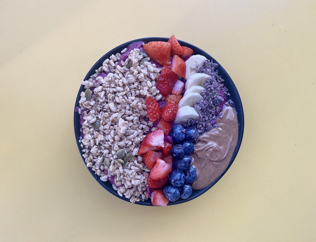 house açai blend topped with strawberries, blueberries, chia seeds, coconut, and granola